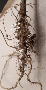 Figure 2: Trochanter mealybugs on a soybean root. (credit: K. Sim) Posted on August 21, 2017 (August 21, 2017) by Tracey Baute in