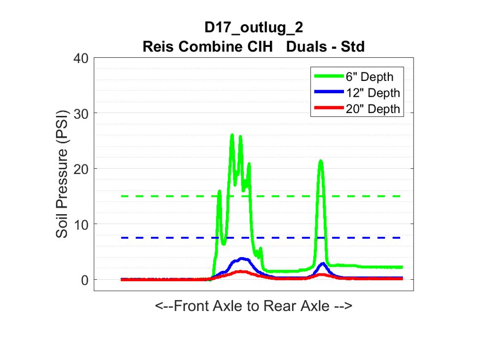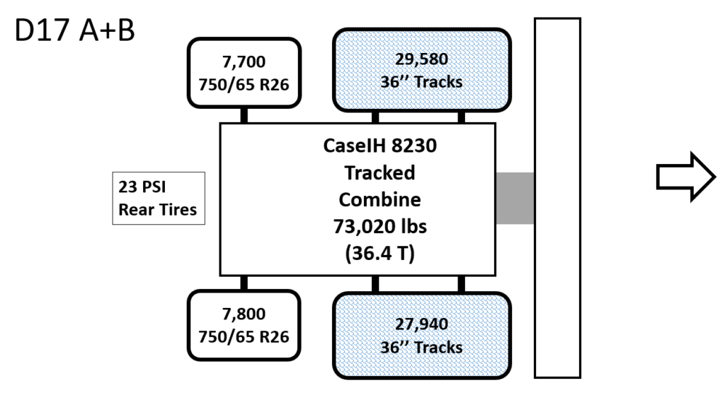 Unit D17: CaseIH 8230 Tracked Combine Posted on January 14, 2019 (January 14, 2022) by Alex Barrie in Compaction Test Results Datasheets Plot Comments This combine showed very high surface stress. Very similar to the D16 plot.Most of the weight is carried by the mid rollers of the trackĀ unit.