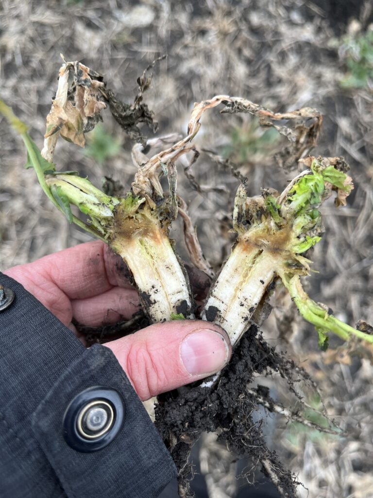 While many fields are acceptable, others have significant areas of rotten plants caused by excess moisture, and some have injured crowns caused by cold temperatures (Figure 1 & 2). Canola is bolting in the southern counties, and in the early green-up stages in Eastern Ontario and northern parts of the growing region (e.g. Simcoe, Grey and Bruce counties). Nitrogen and sulphur should be applied as soon as fields are deemed acceptable, and prior to bolting.