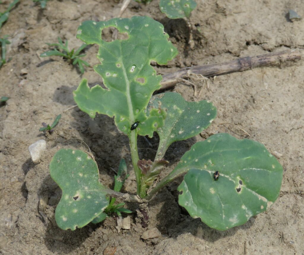 Plant into good soil conditions that promote rapid plant growth and good stand establishment. Planting into cold soils can result in slow plant growth which may give flea beetles more time to feed during early growth stages.