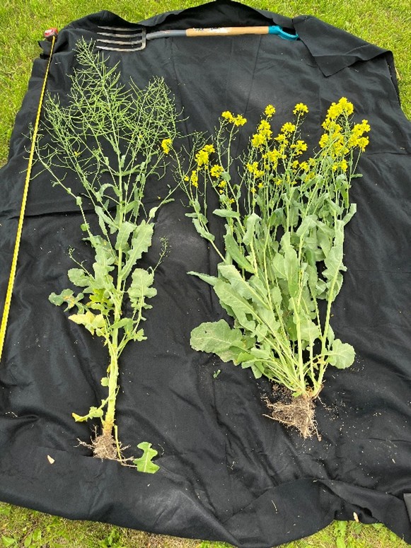Approximately 20,000 acres of seed were sold in 2024. Many producers pushed seeding earlier into August to establish large roots and crowns and improve winter survival. Warm weather lasted until the end of November, resulting in very large plants, especially where the canola was seeded on narrow (7.5”) row widths and where there was a lot of available nitrogen. Although plants did not bolt in the fall, large plants can develop a bit of a stem. When there are a lot of leaves on the rosette, the growing point is pushed up away from the soil surface. Plants like this are more susceptible to winter kill because the growing point is less protected, and large succulent plants can lose a significant amount of tissue through winter. Stand loss did occur in fields with excessive growth, and in many of these fields, the main growing point died, but the crown put out additional stems that were significantly delayed in maturity.