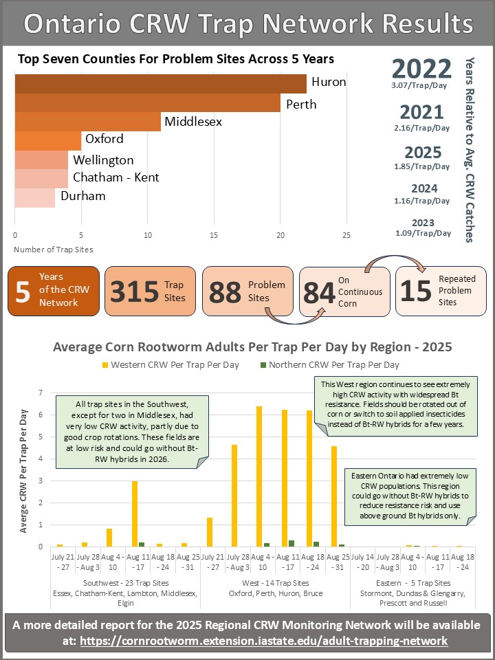 Click here for a downloadable pdf version with Alt Text of the 2025 Ontario CRW Trap Network Infographic.