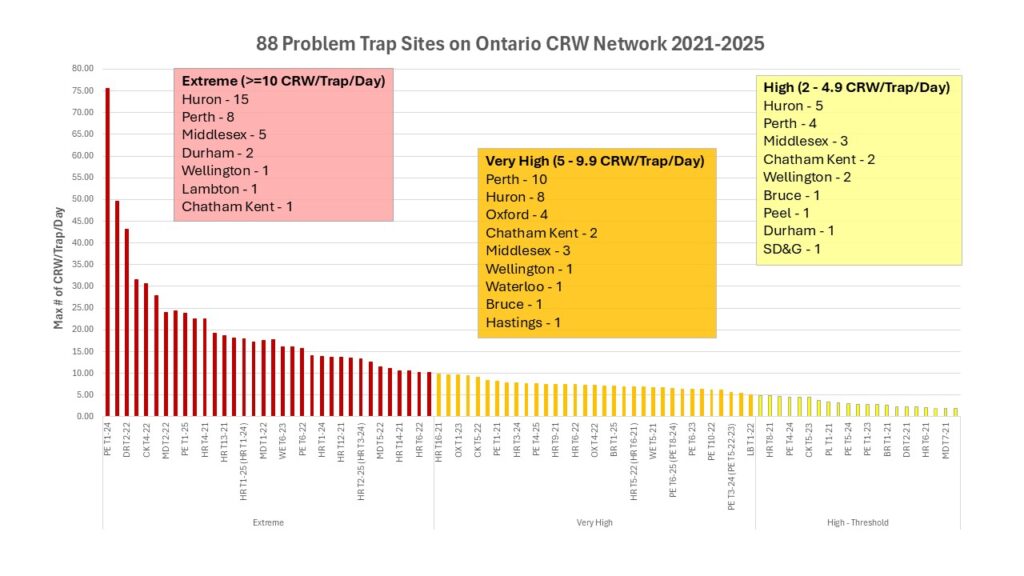 Looking across the five years of CRW trapping in Ontario, we had 315 trap sites monitored, with 88 problem fields identified where corn rootworm reached or exceeded the trapping threshold of 2 beetles per trap per day (Figure 1 and 2). 84 of these problem sites were in continuous corn fields. The counties with the most problem sites over the five years include Huron County at 22 sites in total; Perth, a close second at 20 sites and Middlesex in third at 12 problem sites. 2022 had the highest level of rootworms per trap per day, with 2021 coming in second and 2025 landed in third place with an average of 1.85 CRW beetles per trap per day.