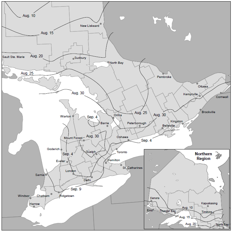 The fall rest period begins around August 15th in Northern Ontario, August 30th in Eastern and Central Ontario, and September 4th in Southwestern Ontario (Figure 1). However, it is difficult to predict when that killing frost will occur. The actual date seldom occurs on the average date, so the beginning of the fall rest period is a guideline only.