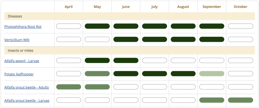 OMAFA’s Crop IPM website includes detailed, interactive scouting calendars for field crops. The scouting calendar below illustrates the typical period of activity of pests in Ontario based on field experience and pest biology research. The actual period of activity can vary significantly from year to year based on environmental factors. For more information on managing each pest, click here, or on the preview image below, to access the scouting calendar for field corn.